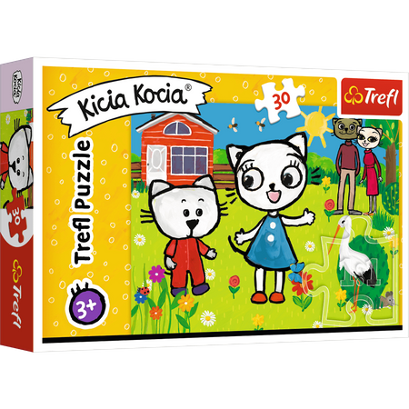 Puzzle z Kicią Kocią to układanka, po ułożeniu której powstaje kolorowy obrazek przedstawiający sympatyczną kotkę z jej braciszkiem Nunusiem i rodzicami.