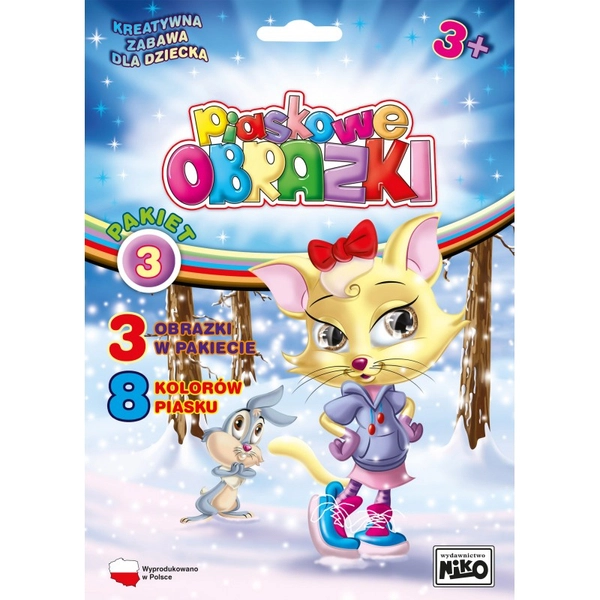- Co to jest: kartonik z wytłoczonym wzorem pokrytym naklejkami, które należy odklejać patyczkiem i posypywać odklejone miejsca kolorowym piaskiem