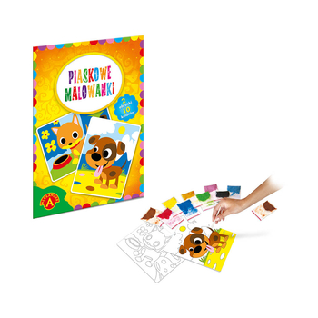 - Zestaw zawiera: 2 obrazki do kolorowania (piesek i kotek), patyczek, 22 woreczki kolorowego piasku, instrukcję, papierową podkładkę