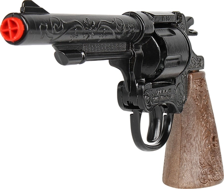 Mały rewolwer doskonale nadaje się do zabawy w dziki zachód. Dzięki swojej realistycznej formie przeniesie was w świat kowbojów. Wykonany z zachowaniem wszelkich norm bezpieczeństwa i z materiałów wysokiej jakości. Czarna lufa oraz drewnopodobna rękojeść przypadną do gustu każdemu miłośnikowi dzikiego zachodu. Magazynek mieści 8 naboi. Przy wystrzale wydaje niezbyt głośny huk i wytwarza dym, dzięki czemu zabawa nabiera kolorów.
