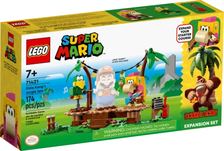 Dzięki temu zestawowi LEGO® Super Mario™ Dżunglowy koncert Dixie Kong — zestaw rozszerzający (71421), dzieci mogą wybrać się do dżungli, domu Donkey Konga™. Zestaw zawiera figurki Dixie Kong i papugi Squawksa, scenę do zbudowania, scenerię dżungli oraz instrumenty muzyczne i sprzęt. Umieść LEGO® Mario™, LEGO® Luigiego™ lub LEGO® Peach™ (figurki nie wchodzą w skład zestawu) na środku sceny i obróć je, aby połączone ze sobą platformy sceniczne zaczęły się obracać, uruchamiając muzyczne dźwięki. Uwaga: do interaktywnej gry wymagany jest zestaw startowy 71360, 71387 lub 71403.