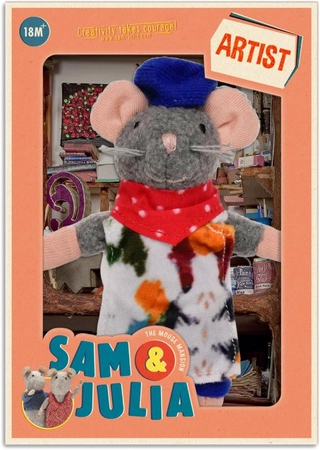 Mysi Domek maskotka Artysta to myszka, jeden z bohaterów serii książeczek, napisanych i zilustrowanych przez Karinę Schaapman. Artysta posiada własną pracownię w Mysim Domku. Jego dzieła możesz znaleźć w całym domku. Maskotka Artysta z Mysiego Domku to szara myszka, ubrana w biały fartuszek poplamiony farbami oraz niebieskie spodnie. Pluszaczek wygląda identycznie, jak ten znany z książeczek. Ciałko myszki zostało wykonane z szarej tkaniny, typu frotte, łapki i wnętrze uszek to dzianina. Czarne oczy, nosek i buzię wyszyto, a wąsiki zrobiono z niteczek. Zabawkę wykonano z dużą precyzją, wykorzystując materiały najwyższej jakości. Myszkę można prać ręcznie. Maskotka ma 12 cm wysokości i przeznaczona jest dla dzieci od 18 miesiąca życia. Ta przytulanka sprawi, że twój smyk przeniesie się w świat Mysiego Domku, pełnego pokoików, zakamarków i schowków.