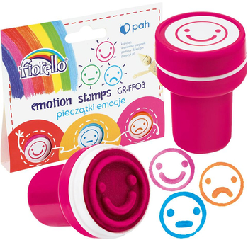 Kolorowe stempelki Emocje dla dzieci to zestaw samotuszujących pieczątek z buźkami wyrażającymi podstawowe emocje. W opakowaniu znajdziemy trzy stempelki: pomarańczową buźkę neutralną, zieloną - uśmiechniętą oraz niebieską - smutną. Pieczątki pomagają oswajać dzieci z emocjami, jak również mogą mieć zastosowanie motywacyjne i wychowawcze, pozwalając wizualnie nagradzać lub korygować zachowanie dziecka. Doskonale sprawdzą się także w zabawie, twórczości plastycznej, zdobieniu zeszytów. Producentem pieczątek jest ceniona firma Fiorello.