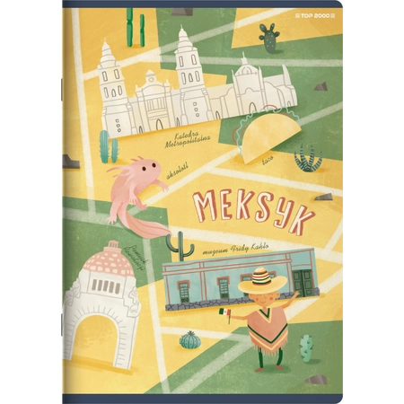 Zeszyt 32-kartkowy Meksyk marki TOP-2000 wyróżnia się okładką ze stylową ilustracją nawiązującą do Meksyku i związanych z nim motywów. Okładka jest matowa i posiada subtelne uszlachetnienia w postaci błyszczących akcentów z lakieru UV. Format to klasyczne A5. Wysokiej jakości kartki zadrukowane są kratką z marginesem i mają zaokrąglone rogi. Zeszyt został wyprodukowany w Polsce.