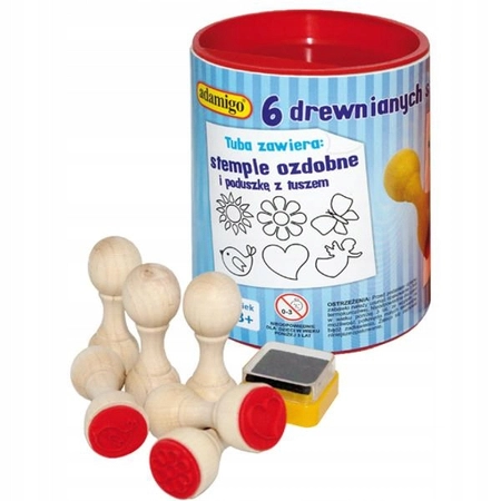 - Zestaw zawiera: sześć stempelków oraz poduszkę z tuszem