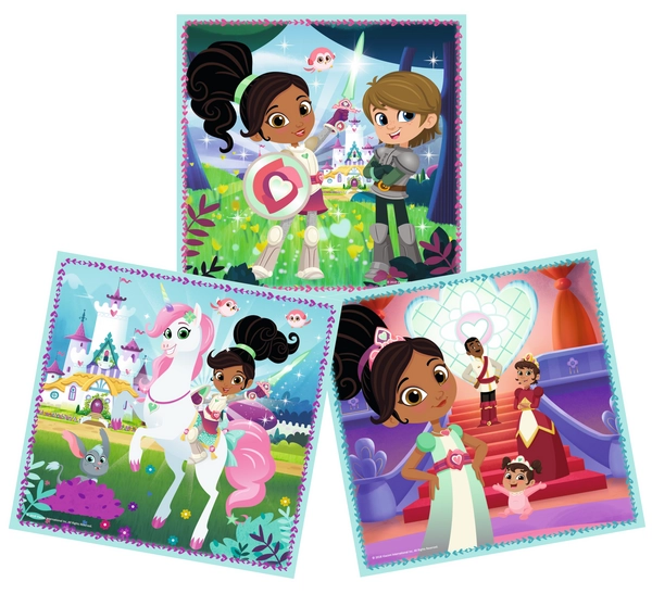 Puzzle Rycerka Nella (ang. Nella The Princess Knight) to układanka przedstawiająca bohaterów bajki o dzielnej królewnie - rycerce. Po ułożeniu 3 układanek o różnym stopniu trudności, powstają obrazki z Nellą w roli gównej.