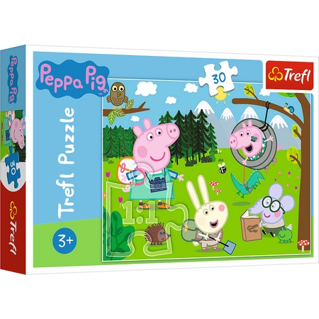 Puzzle Świnka Peppa (Peppa Pig) to układanka przedstawiająca ulubionych bohaterów brytyjskiej bajki. Po ułożeniu 30 elementów powstaje obrazek, na którym znajduje się Peppa, George i przyjaciele w czasie leśnej wyprawy.