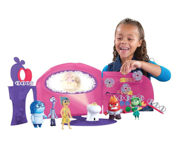 Centrala z filmu Disney'a w formie dużej, rozkładanej zabawki. Trzy skrzydła zawierają w sobie strefy pozwalające dzieciom odtwarzać sceny z bajki. Jedna ze stref to trzy poziomowa zjeżdżalnia dla załączonych kul pamięci. Kule, tocząc się, obracają kolorowe wiatraczki. W środkowej części centrum dowodzenia znajduje się miejsce dla konsoli, w której można zamontować biały projektor posiadający funkcję wyświetlania scen z życia Riley zapisanych w kulach pamięci, wystarczy włożyć je w zagłębienie projektora, zgasić światło i skierować projektor na środkową ścianę Centrali. Wówczas na białym ekranie pojawi się jedna z zapisanych w kulach scen z przeszłości Riley, głównej bohaterki filmu. Duża figurka Radość (Joy) jest świetnym uzupełnieniem zabawki; ma ruchome ręce i głowę, a jej ciało pokryte jest brokatem. W zestawie akcesoria, sofa i podnóżek. Jeśli nie wiesz gdzie kupić inne zabawki z bajki "W głowie się nie mieści", sprawdź nasz sklep internetowy.