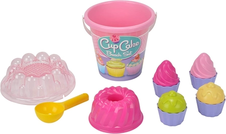 - 12 elementów: wiaderko, 4 2-częściowe babeczki, 1 foremka duża babka, łopatka w kształcie łyżki, pokrywka sitko