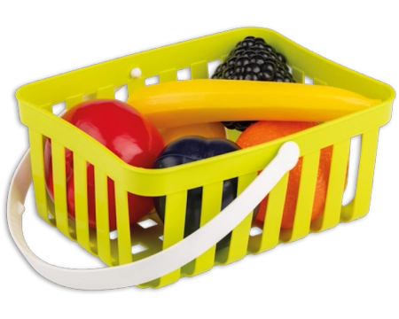 Koszyk z owocami dla dzieci to zestaw składający się z dziewięciu elementów, pozwalających na zabawę w zakupy. Zabawkami można bawić się także w piaskownicy. Koszyczek dostępny jest w kolorze zielonym. Ma wygodną rączkę z antypoślizgowymi wypustkami po wewnętrznej stronie. Dołączone owoce to: pomarańcza, dwie mandarynki, winogrona, jabłko, gruszka, śliwka i banan. Wszystko zostało wykonane z wysokogatunkowego tworzywa, które nie wydziela nieprzyjemnego zapachu.