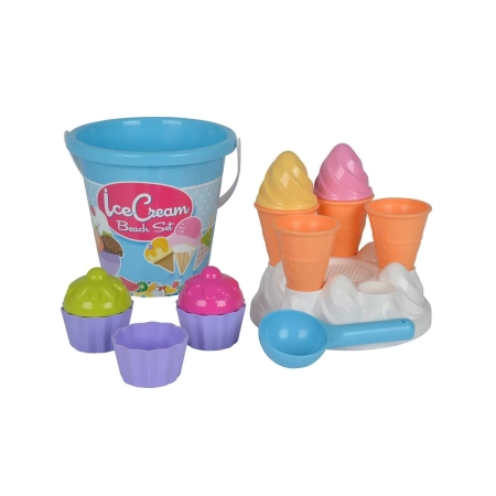 - 14 elementów: wiaderko, 3 babeczki, 4 rożki do lodów, 2 foremki - kremowe nadzienie babeczek, 2 foremki - lody, łyżka, stojak na lody - pokrywa wiaderka