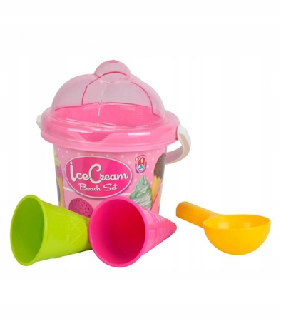- 4 elementy: wiaderko z pokrywką, 2 rożki do lodów, łyżka