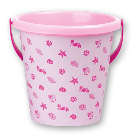 Wiaderko do piasku dla chłopca w odcieniach różu ozdobione jest grafiką nawiązującą do plaży, morza i wypoczynku wakacyjnego. Drobne muszelki, ślimaczki, kraby i inne typowo morskie żyjątka, zostały trwale naniesione na powierzchnię wiaderka, dzięki czemu nie odkleją się. Uchwyt to wygodna rączka od wewnętrznej strony pokryta wypustkami, zapobiegającymi ślizganiu się w rączce dziecka.