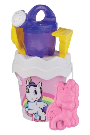 - W zestawie: wiaderko, pokrywka pełniąca jednocześnie rolę sitka, żółte grabki i łopatka, foremka w kształcie jednorożca, fioletowa konewka zdobiona brokatem