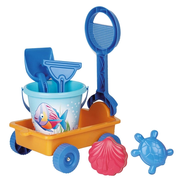 Zestaw zabawek do piasku Przyczepka i akcesoria to sześć elementów, które pozwolą na fantastyczną zabawę w piaskownicy lub na plaży. W skład zestawu wchodzi turkusowe wiadereczko z nadrukowaną trwale grafiką przedstawiająca wesołe i kolorowe rybki, niebieskie grabki, niebieska łopatka, dwie foremki, których kształt może się różnić w różnych zestawach oraz pomarańczowa przyczepka ze składaną rączką. Dzięki temu, że przyczepka jest niewielka, zawsze można zabrać ją ze sobą, nie zajmie dużo miejsca.